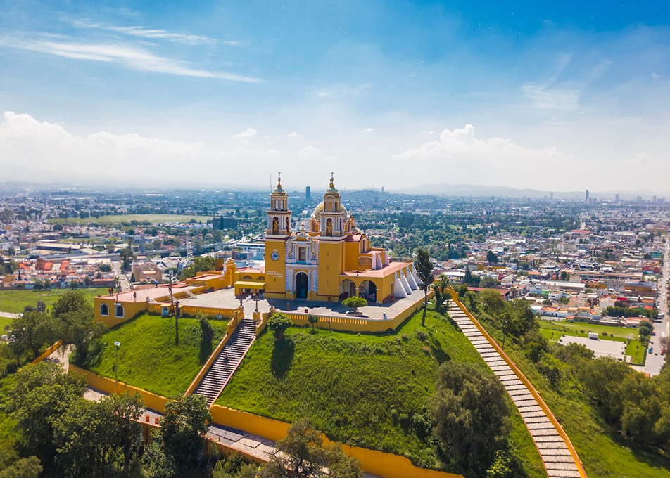 Cholula is one of Mexico’s magic towns where the buildings throughout the city center are colorful and cute. Cholula is also known for having the largest pyramid in the world (by volume} and a beautiful golden church that sits atop of it.